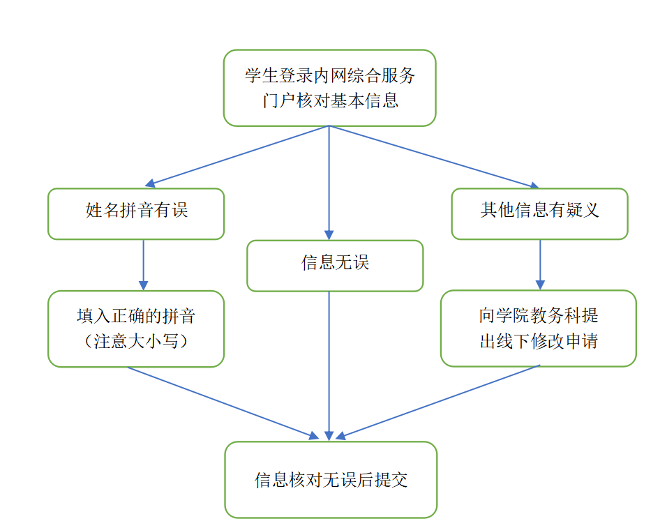 2.毕业生信息核对工作事关学生毕业证书、学位证书发放及网上注册等重大事项,请学生本人务必认真核对自己的有关信息,确保准确无误,特别需要注意的是在学期间修改过信息的学生。姓名拼音有误可以直接修改后提交,其他信息有疑义需要提交支撑材料跟教务科联系修改。
