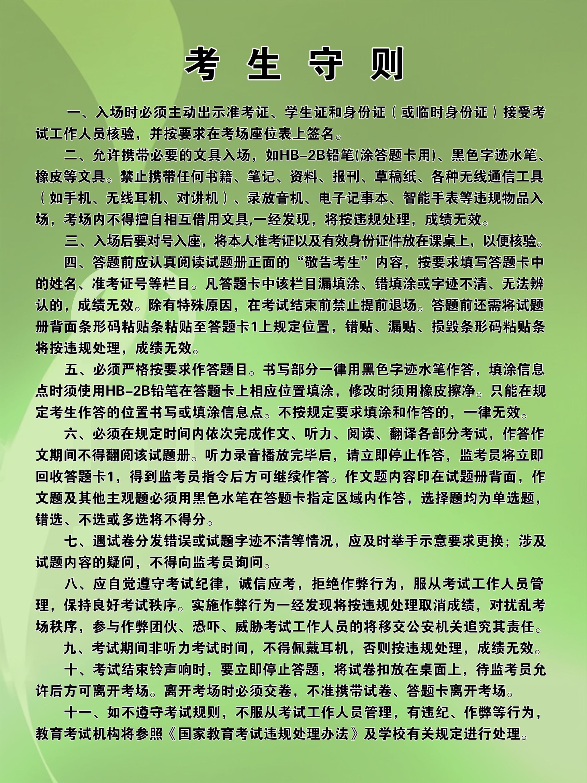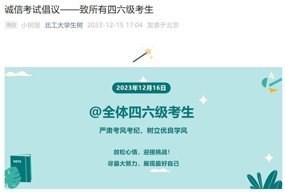 学校特别强调严肃考风考纪,利用广播、宣传展板、网络等多种渠道宣传学术道德和诚信考试,要求相关班级组织诚信教育,增强考生对诚信考试的认识,确保考试的顺利进行。