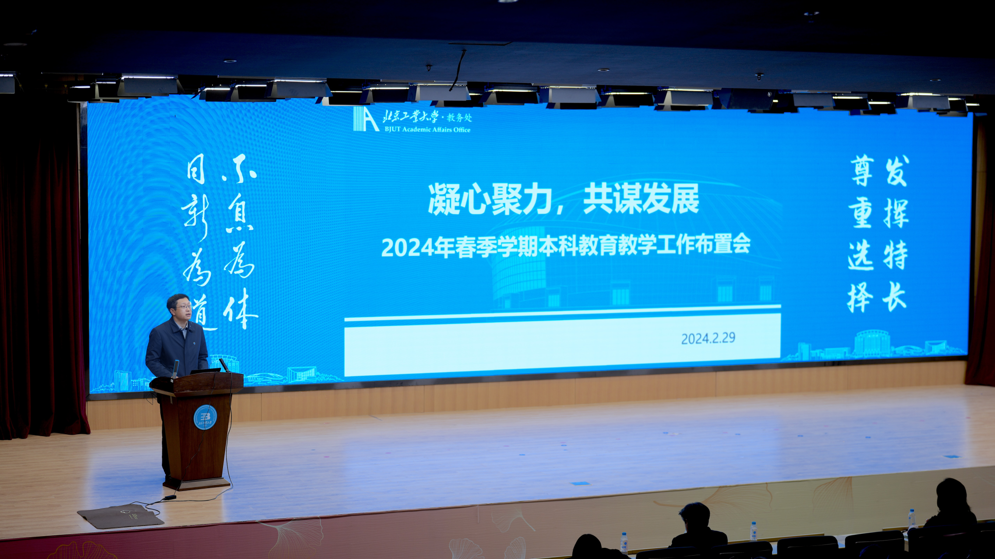 2月29日,我校在逸夫图书馆学术报告厅组织召开了2024年春季学期本科教育教学工作布置会。党委常委、副校长李建荣出席会议并讲话。各学部(院)主任(院长)、教学副主任(副院长)、教学管理人员、专业负责人、招生负责人,学校督导专家、教务处、招生办公室及教学质量督导评估办公室全体工作人员参加会议。教务处处长、招生办公室主任刘赵淼主持会议。