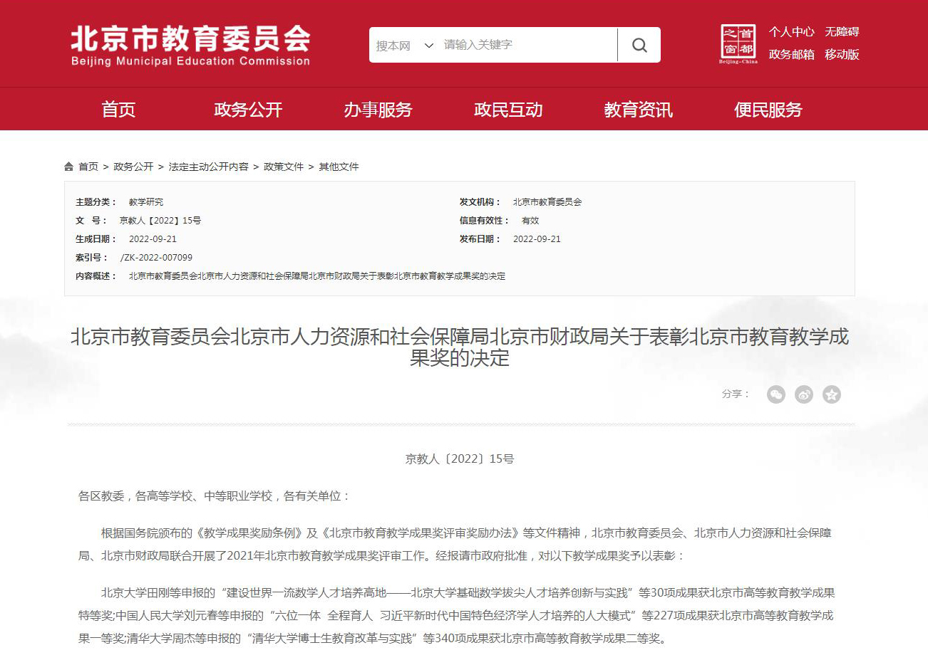 近日,北京市教育委员会、北京市人力资源和社会保障局、北京市财政局发布了《关于表彰北京市教育教学成果奖的决定》(京教人〔2022〕15号)。我校共17项教学成果荣获2021年北京市高等教育教学成果奖,其中聂祚仁等申报的“数字化绿色化协同的材料生命周期工程人才培养”成果获特等奖;杜修力等申报的“需求导向、学科牵引,构建基于广义工程观的土木工程创新人才培养新体系”等11项成果获一等奖;唐军等申报的“社会工作专业‘三实一体’实践教学创新体系的构建与应用”等5项成果获二等奖。今年是我校继2008年后,再次荣获北京市高等教育教学成果特等奖。