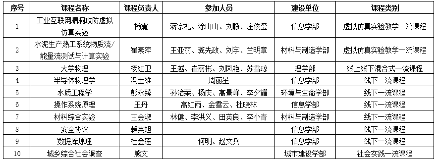 近日,教育部发布了《关于第二批国家级一流本科课程认定结果的公示》,我校共有10门课程入选,包括虚拟仿真实验教学一流课程2门、线上线下混合式一流课程1门、线下一流课程6门、社会实践一流课程1门。