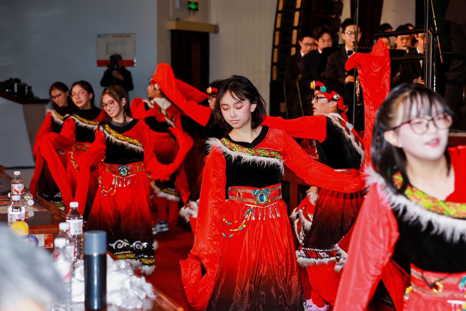 工大附中高中部西藏学生演出的舞蹈《扎西与卓玛》,为音乐会营造了中华民族团结一家亲的温馨氛围。